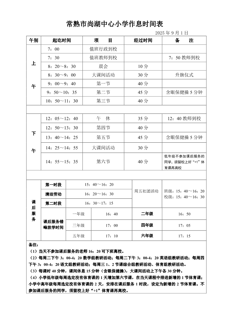 常熟市尚湖中心小学2025-2026学年作息时间表